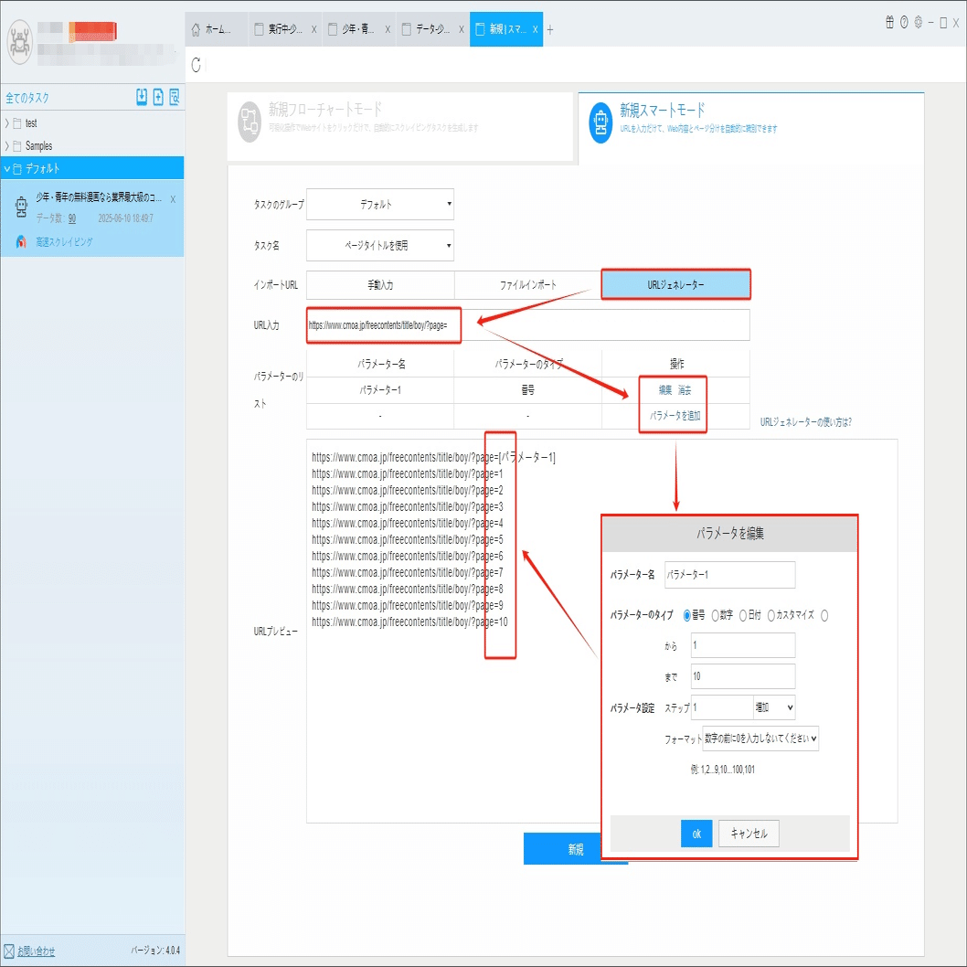 URLジェネレータでURLを入力して、パラメーターを追加画面にページ数を入力し、生成したURLはプレビュー画面でチェックしてください。