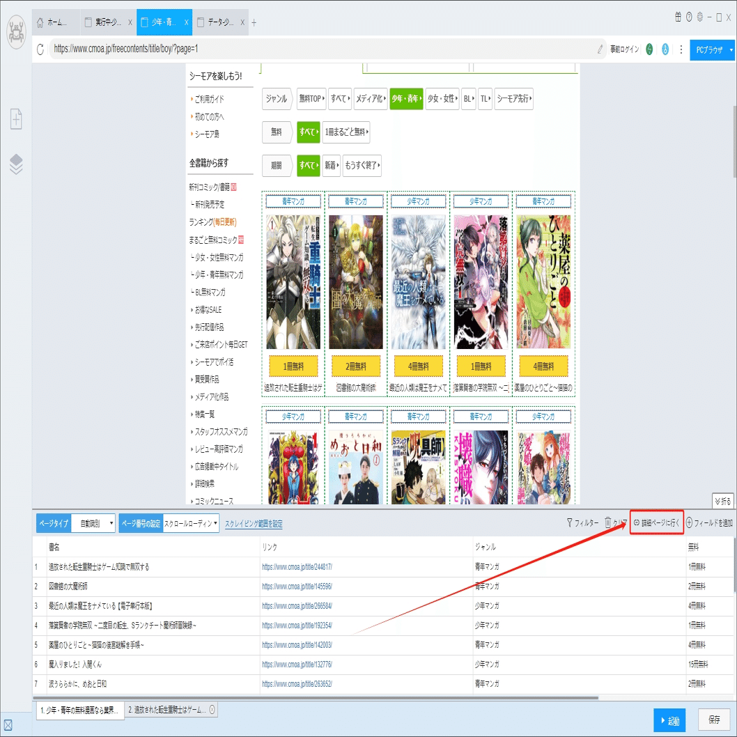 ソフトウェアの「詳細ページに行く」機能を利用し、評価、価格、作品内容などの情報を抽出します。