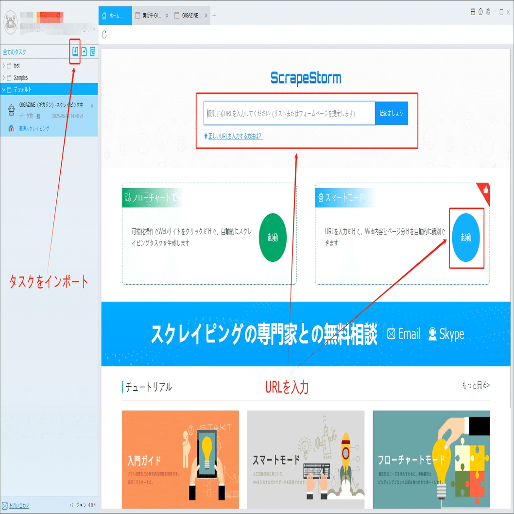 ScrapeStormのホームページ画面にスマートモードタスクを新規作成します。また、持っているタスクをインポートすることもできます。