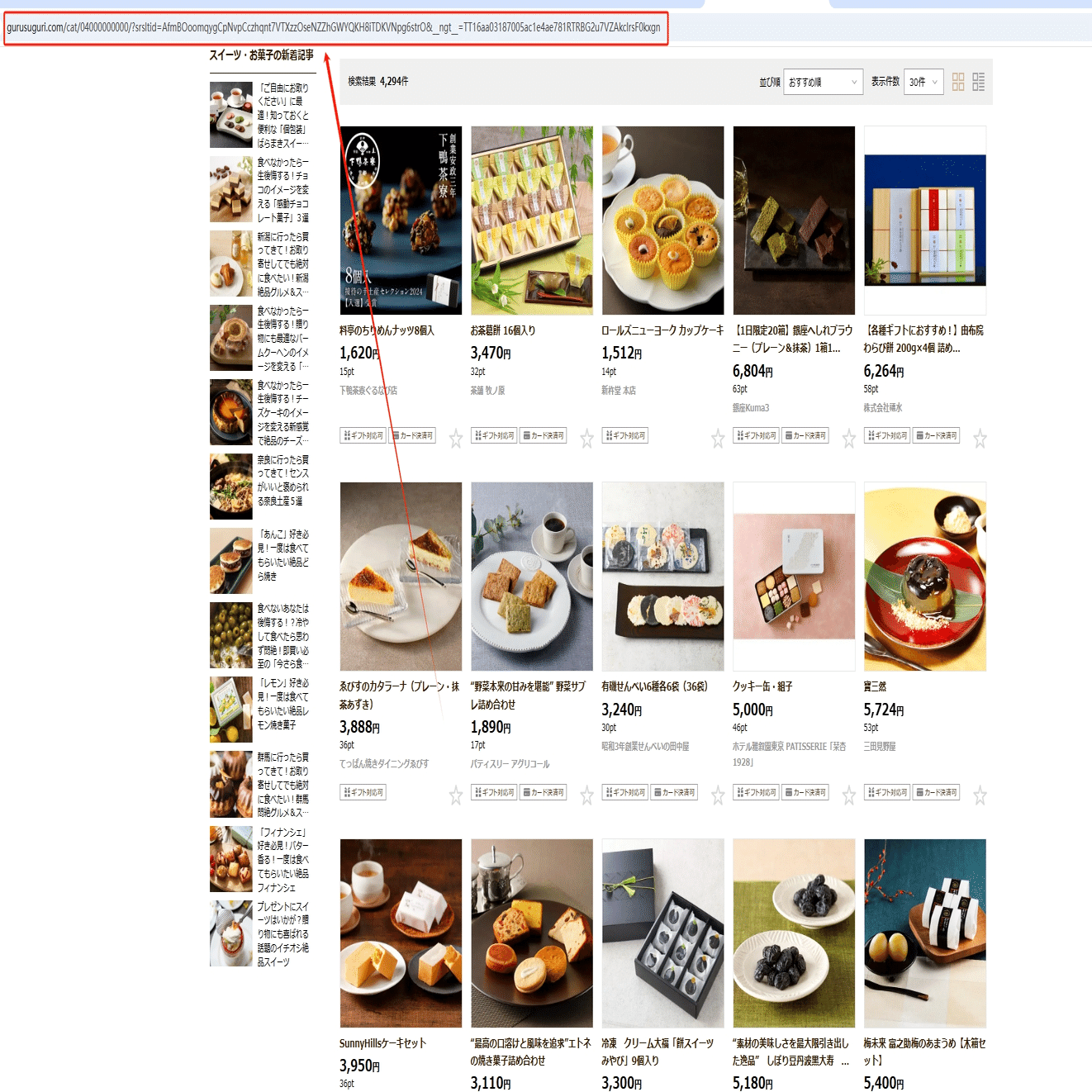 今回はスイーツ・お菓子の商品一覧ページから商品の情報を収得し、そのスクレイピング方法を紹介します。まず、URLをコピーしてください。