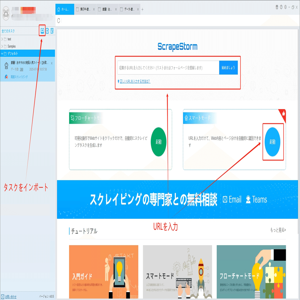 ScrapeStormのホームページ画面にスマートモードタスクを新規作成します。また、持っているタスクをインポートすることもできます。