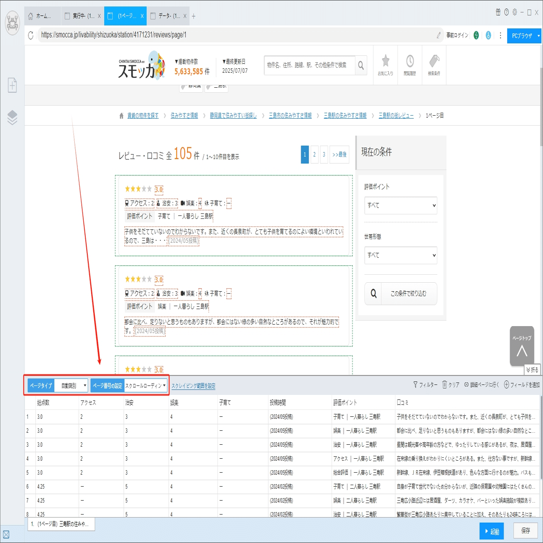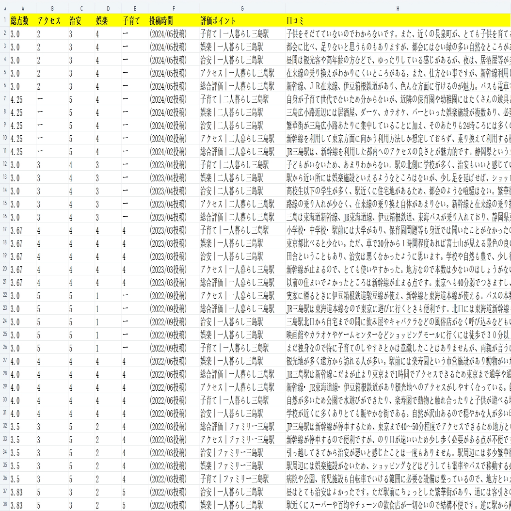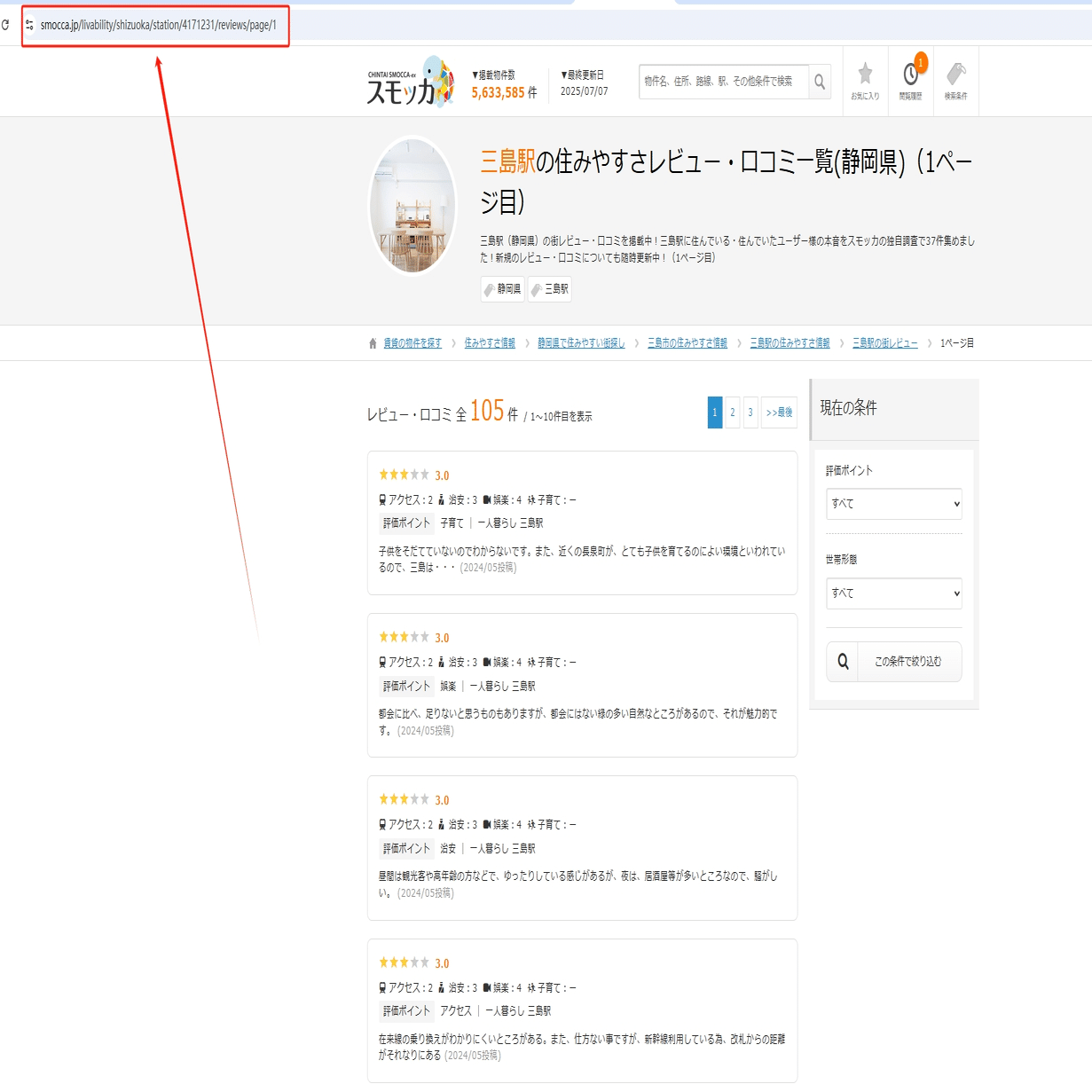 今回は三島駅の住みやすさレビュー・口コミ一覧ページから評価の情報を収得し、そのスクレイピング方法を紹介します。まず、第二ページのリンクをコピーしてください。