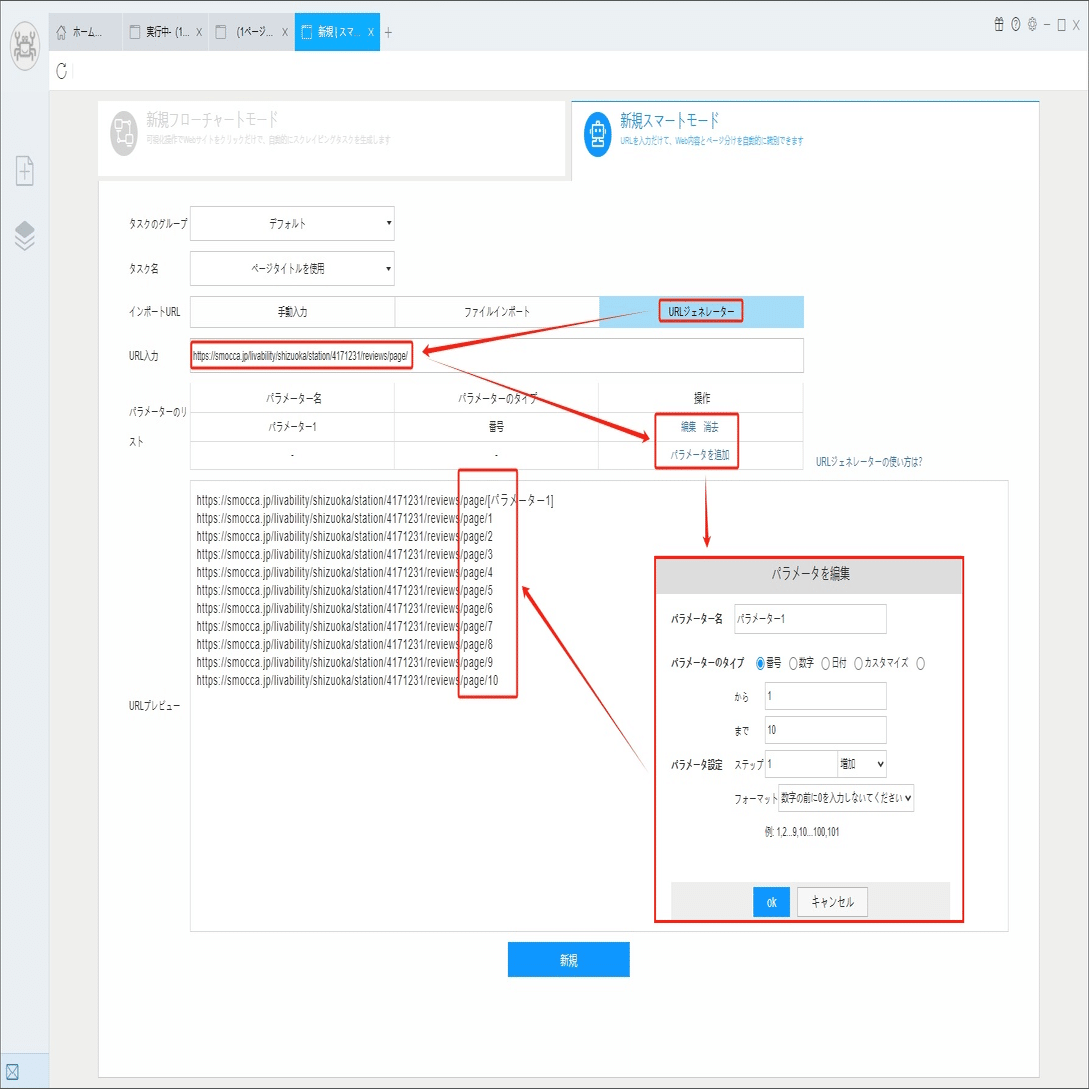URLジェネレータでURLを入力して、パラメーターを追加画面にページ数を入力し、生成したURLはプレビュー画面でチェックしてください。