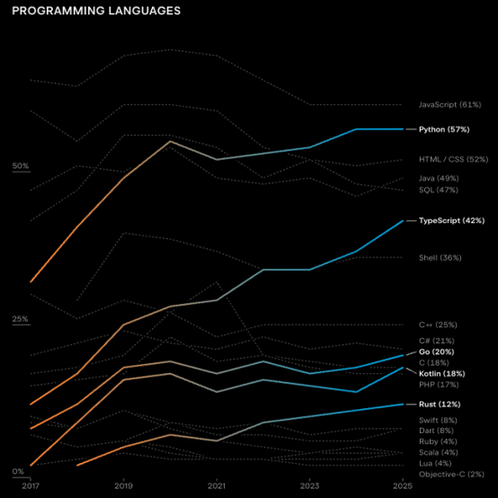 過去5年間で、実際の使用率が最も大きく伸びたのはTypeScriptでした。同時に、Rust、Go、Kotlinも着実にシェアを拡大していますが、成長のスピードはTypeScriptほどではありません。