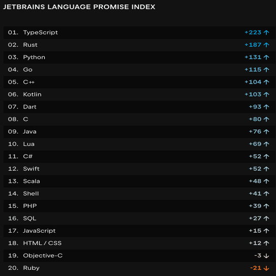 JetBrainsの「Language Promise Index(言語将来性指数)」によると、言語の成長ポテンシャル、安定性、開発者の採用意欲をもとにランク付けが行われています。2025年のデータでは、TypeScript、Rust、Goが最も高い成長ポテンシャルを示し、JavaScript、PHP、SQLはすでに成熟期に達していると考えられています。