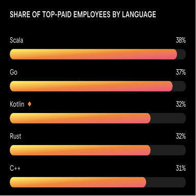 おもしろいことに、高収入の開発者の中ではScalaの割合が最も高く、38%に達しています。主要言語として使用している開発者はわずか2%であるにもかかわらず、ニッチなスキルが高い報酬につながることを示しています。