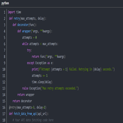 @retry 装飾子は、例外が発生した際に指定回数リトライを行い、処理の安定性を高めます。