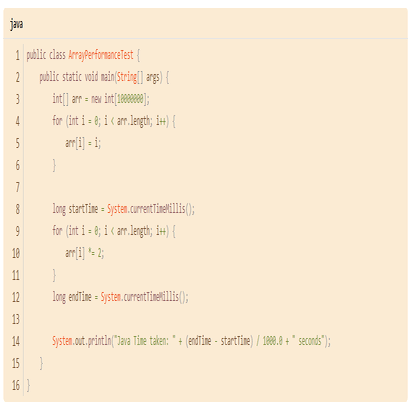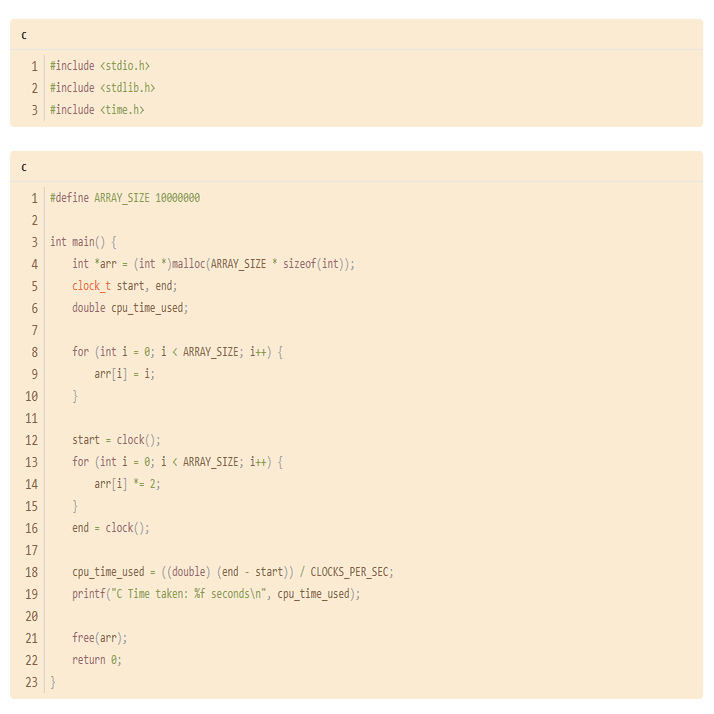 JavaとC言語の実際の性能差をより直感的に示すため、以下の代表的なシナリオでテストを行った。