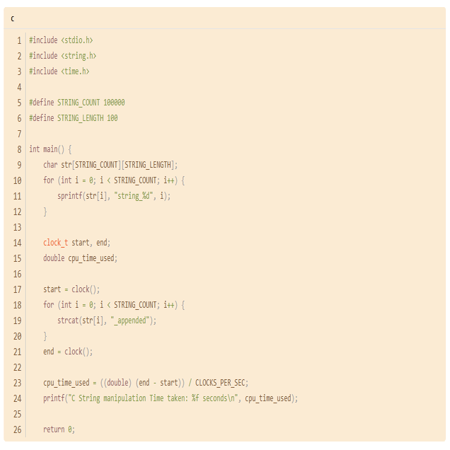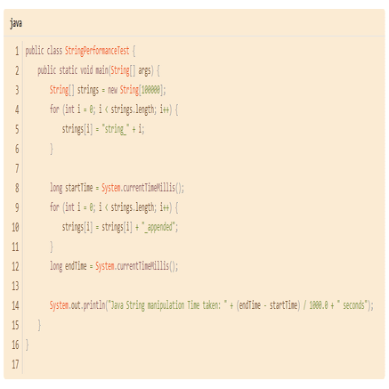 C言語では strcat などを用いて文字配列を直接操作できるため効率が高い。一方、Javaの文字列は不変(immutable)であり、結合のたびに新しいオブジェクトが生成されるため、性能面で不利となる。